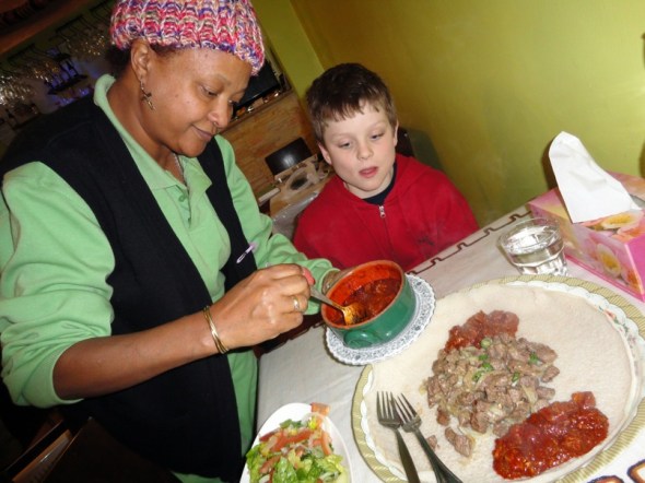 It seems the days of us ordering only a salad and tibs at Ethiopian places are gone – the staff advise us that, no, that won’t be enough. I shouldn’t be surprised – Bennie’s a 10-year-old rugby player whose appetite is expanding.