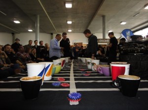 The judges base their assessments on temperature, taste and latte art, using poker chips to denote their ratings.