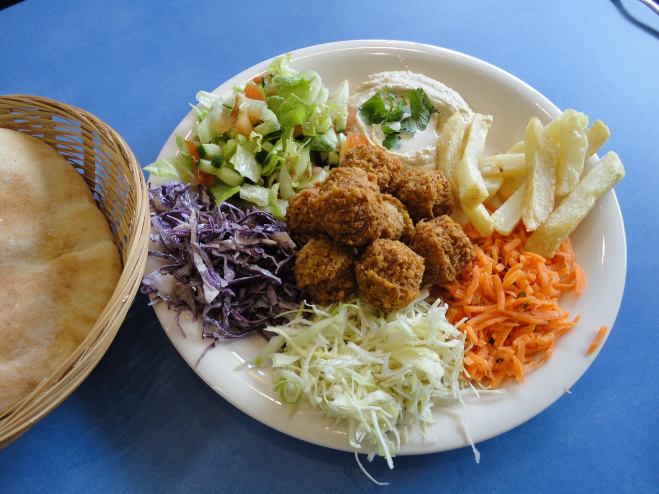 It boasts a handful of average chips, a mixed green salad of the type so familiar to us from our various Middle Eastern haunts, a mayo-dressed red cabbage salad, unadorned white cabbage and carrot, and nice glob of good fresh hummus.