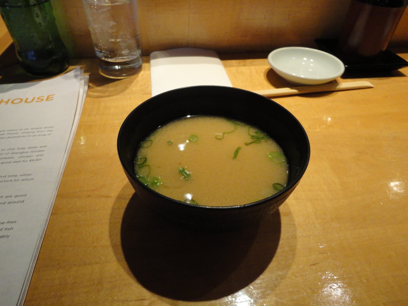 The miso soup is good, the right temperature and studded with tiny cubes of tofu, though lacking seaweed or mushrooms.