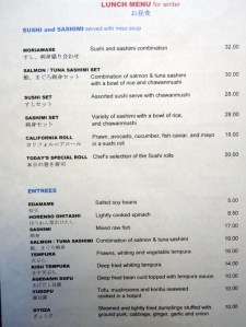 And the prices have crept up, of course. The daily bento is $19. Teishoku dishes such as wafu steak or sukiyaki with rice and miso soup are all $20 or more. Yakisoba noodles are $16 and most of the various sushi/sashimi combos at or around the $30 mark.