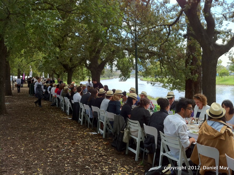 The first thing that grabs your attention about the World’s Longest Lunch is the logistics: 1,200 people enjoying fine dining along the Yarra, across from the Melbourne’s Olympic Park precinct. A table that seems to stretch forever. And today, after Melbourne’s rolling wet weather, a perfect day by the river.