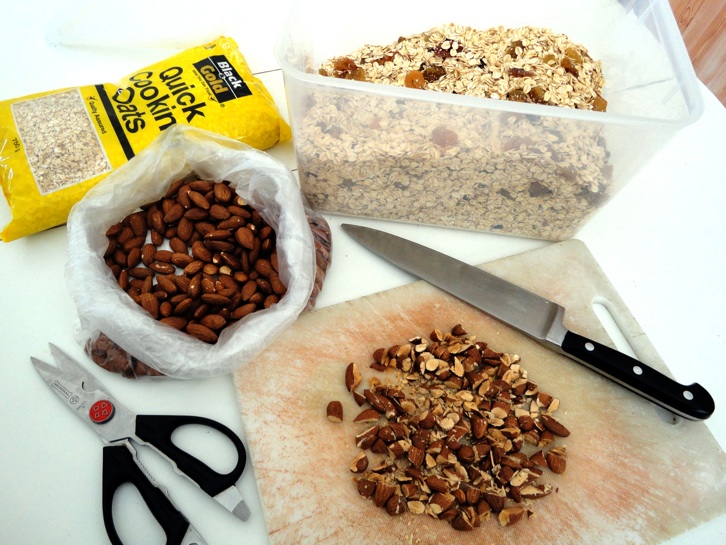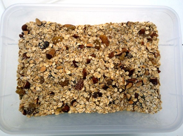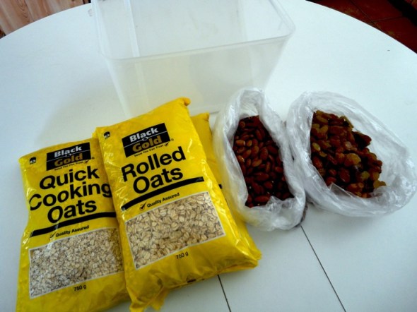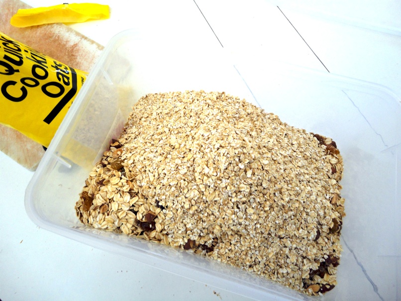 Finally, add the crushed oats and mix well – and carefully, especially if your container only just holds the amount of muesli being made!