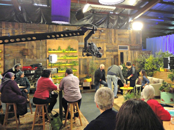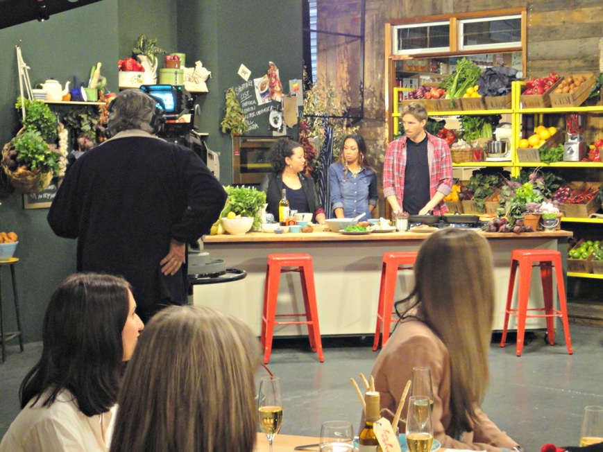 The set is bright and cheerful “rustic foodiness”, with a cooking area to one side, sofas for interviewing purposes on the other.