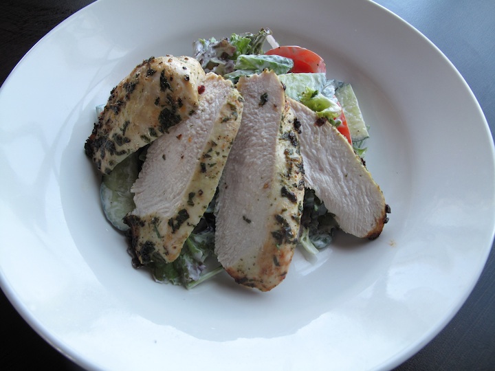 Veronica is pleased with her lemon pepper chicken salad with a yogurt dressing.