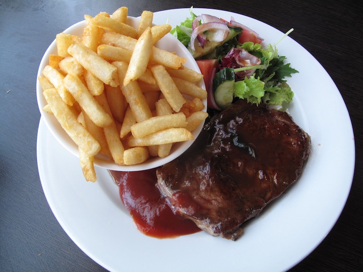 Neil has the porterhouse steak ($21). I’m told he always does, in this case complementing the red–wine sauce with a dollop of good, old-fashioned sauce of the tomato variety.