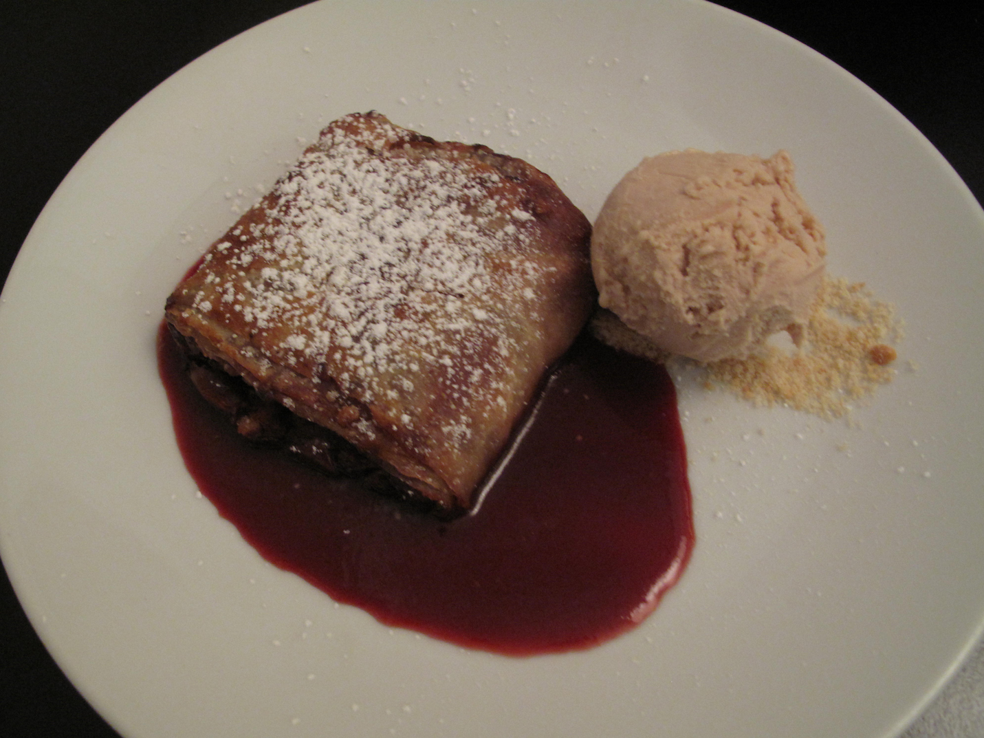 Štrudla od višnje (sour cherry strudel with hazelnut ice cream, $17) and …