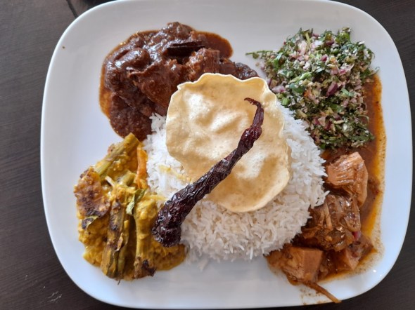 His meal includes a great, tangy coconut sambol and jackfruit curry.
