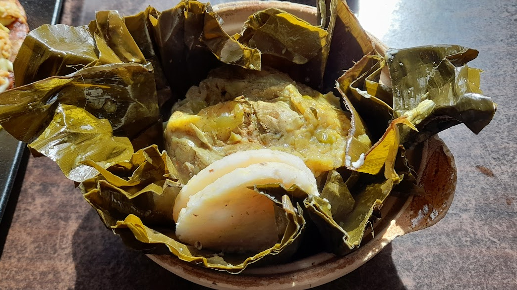 Encased in the banana leaves are rice, pork, chicken, egg, carrot and green beans.