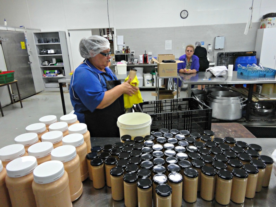 The spotlessly clean production, bottling and cooking area looks like a small factory but is also recognisably a kitchen.