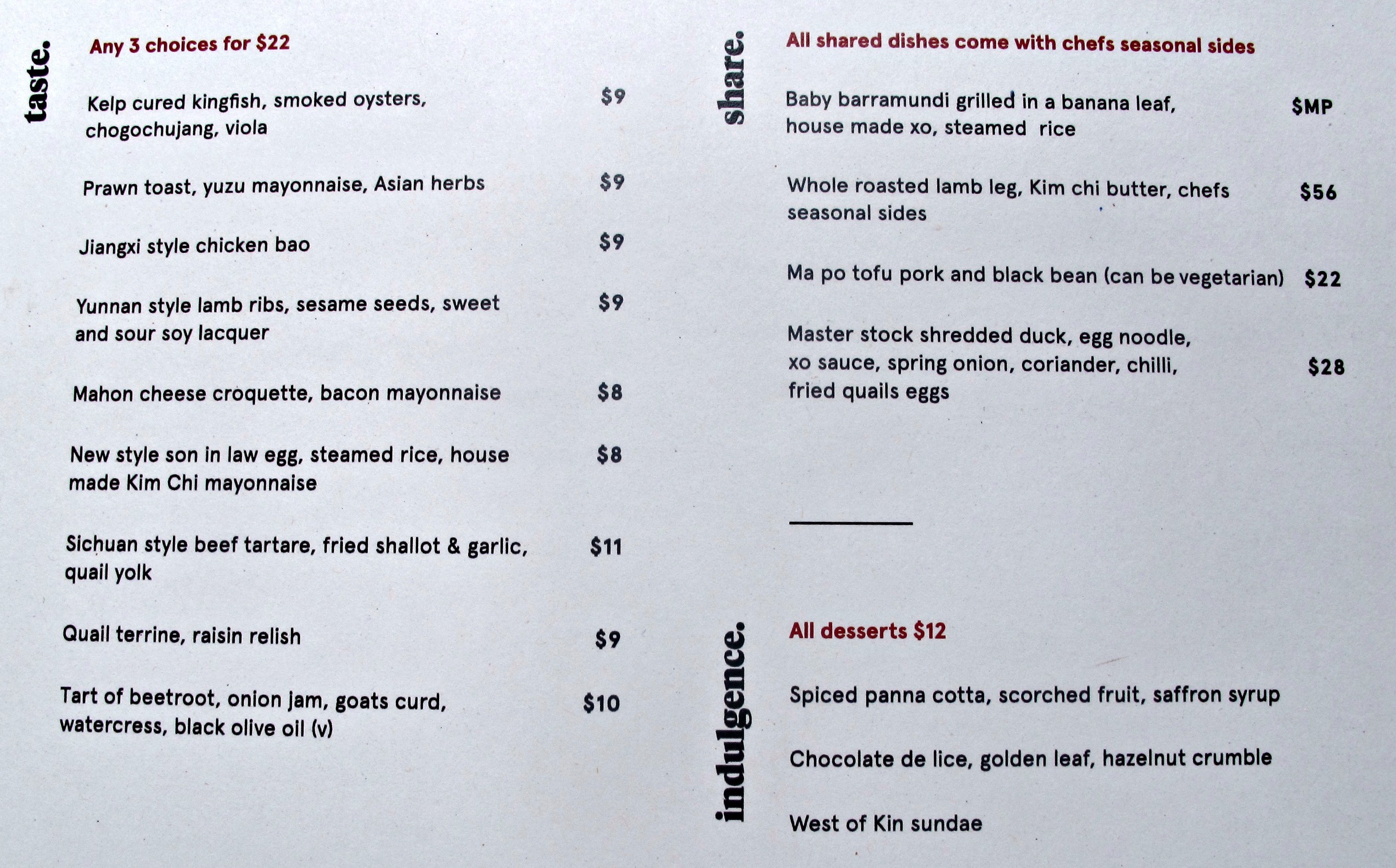 We have just one criticism … the main course that has gone untried by us is the whole roasted lamb leg with kimchi butter and chef’s seasonal sides ($56).