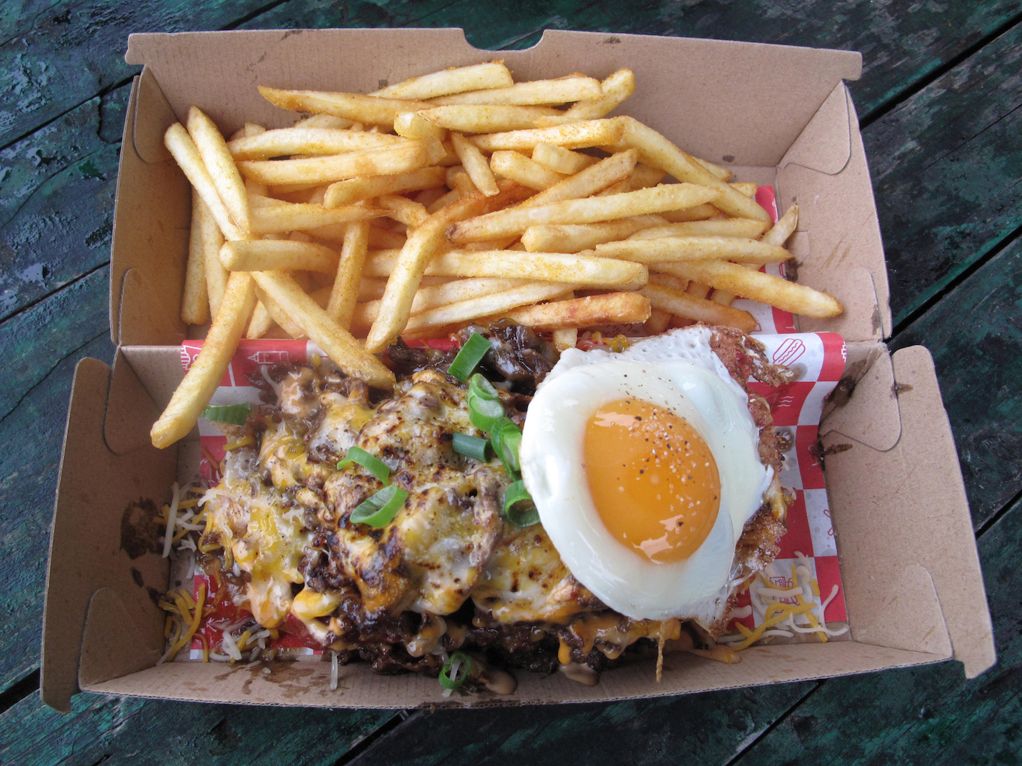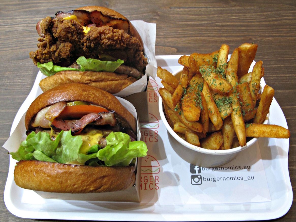 The burger is attended by another bowl of wonton fries, “yuzu” mayo and pickles.