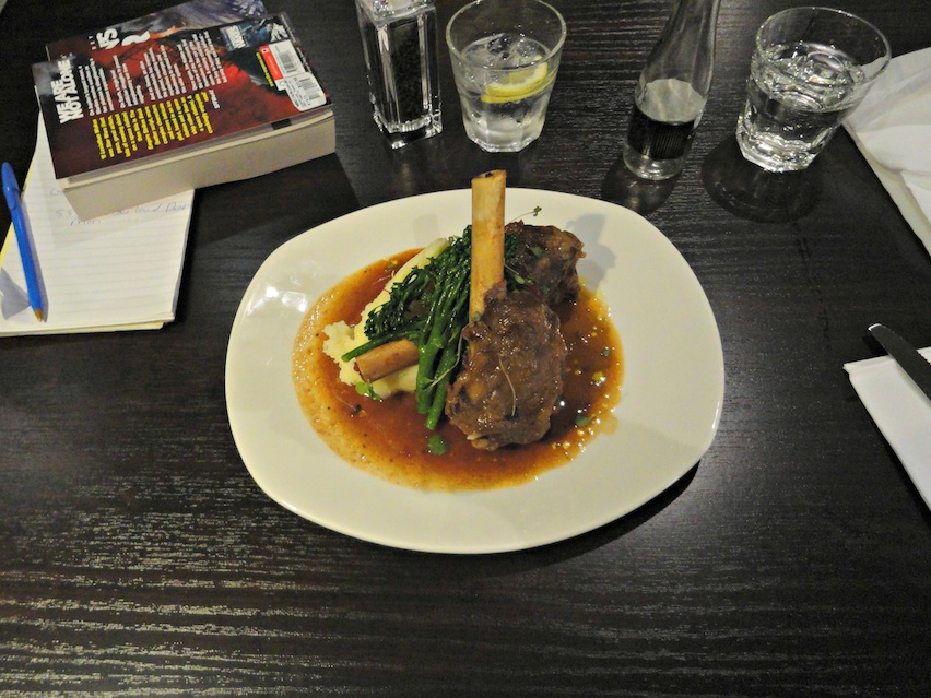 The garlic mash has a slightly bitter edge to it, but both it and broccolini play nice second fiddles to the tremendous shanks. A greater quantity of juice/gravy would’ve hit the spot with me, though I know that’s not bistro style.