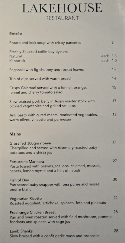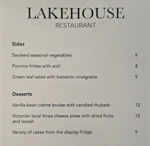 NOTE: The menus below represent the Lakehouse opening night offerings – the regular menu will be along the same lines but, I’m told, longer.