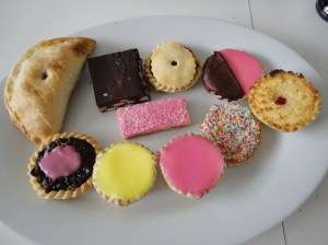 Oh, sweetie! Clockwise from top left: Apple turnover, hedgehog, boozy Christmas mince pie, neenish tart, coconut tart, sprinkle biscuit, swiss blueberry tart, swiss lemon tart, regular mince pie. Centre: Jam slice.