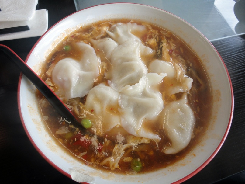 The soup is delicious – of mild spiciness, it’s chock-full of egg, tofu strands, mushrooms, chilli, peas and perhaps more.
