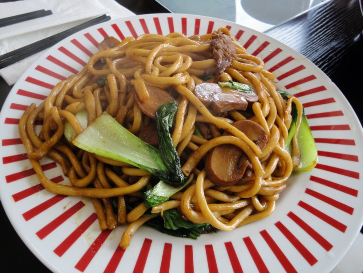 Joining the noodles are fresh mushrooms, bok choy and tender beef pieces, the lot tossed in a soy and oil sauce.
