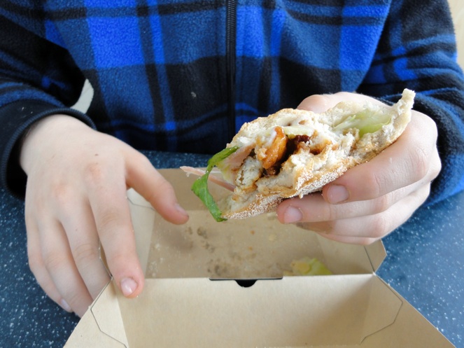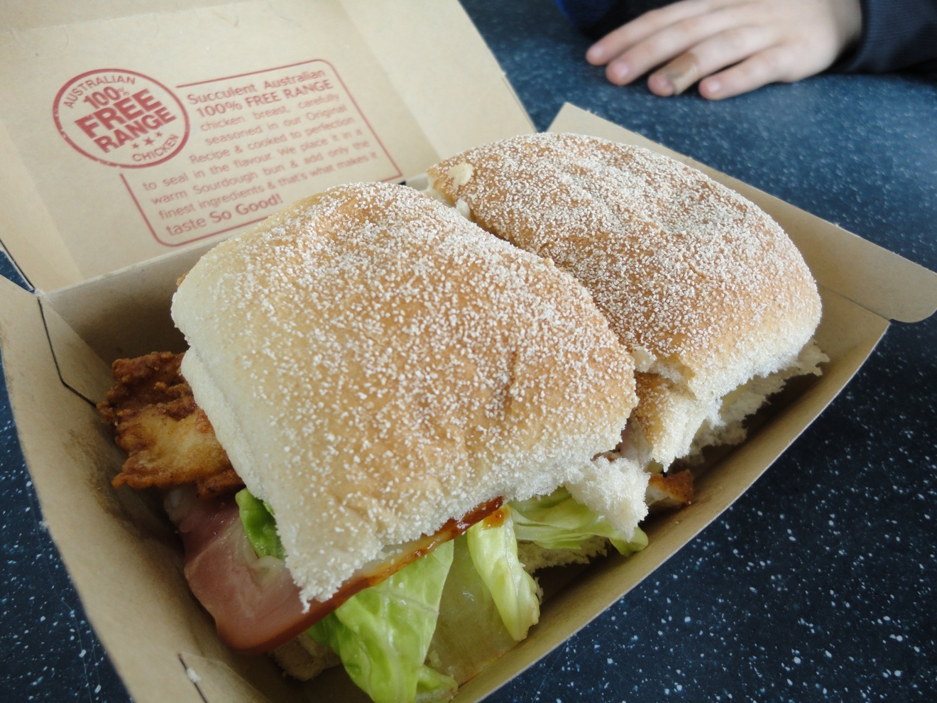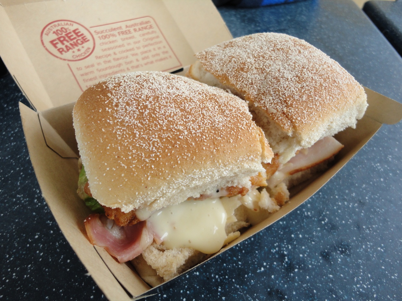 Nor does the chicken bulge out from under the “warm sourdough buns” as strongly suggested in the advertising. Big surprise, eh?