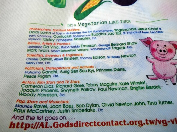 On the outside, the bag is printed with slogans promoting vegetarianism – “change your life” and the like – and a chook that proudly boasts that “we pray for you”.