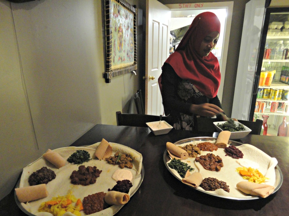 They include injera rolled up like roti rolls and including dal, a sort-of bolognese and a spicy cheese-and-green number – all absolutely delicious!