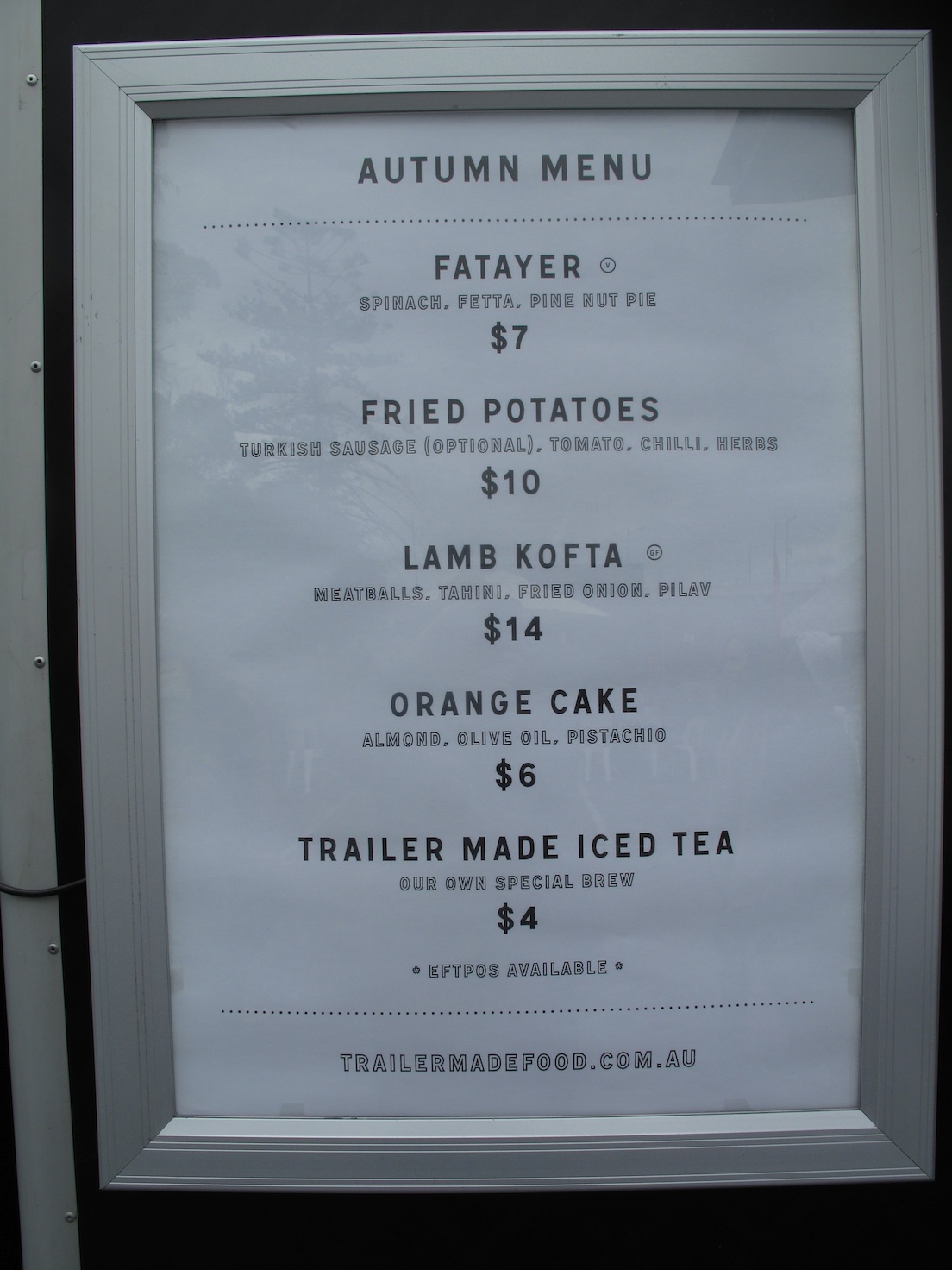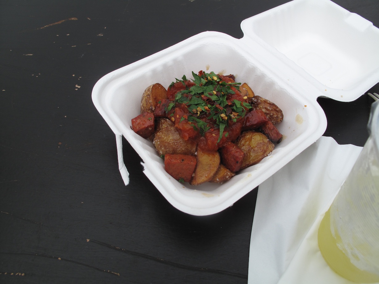 From Amy at Trailer Made Food, I secure a serve of fried potatoes with tomato sauce and Turkish sausage ($10).