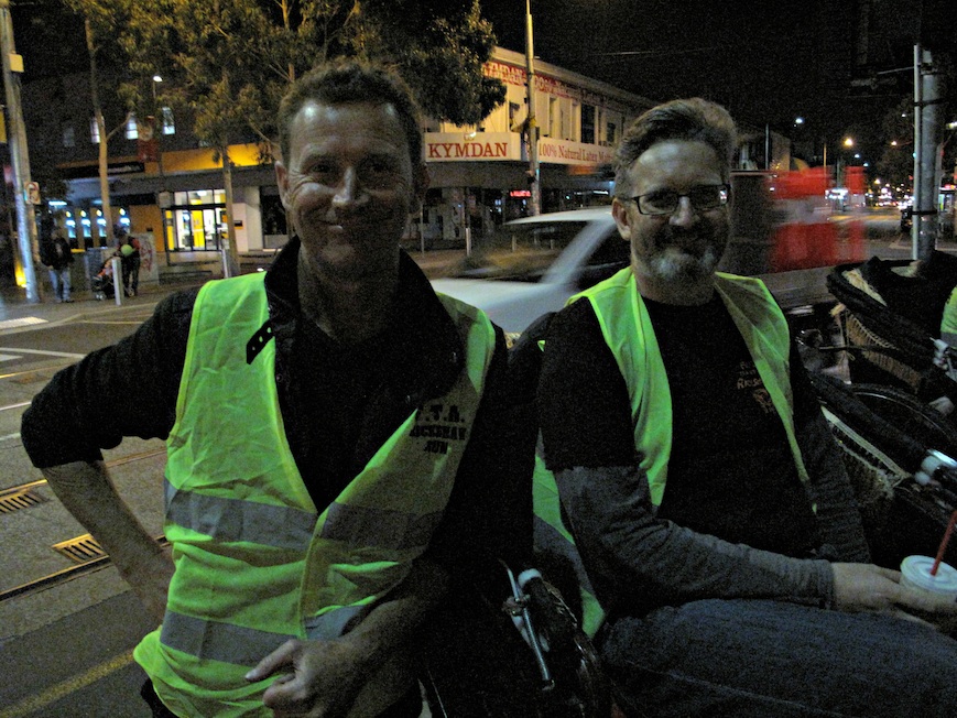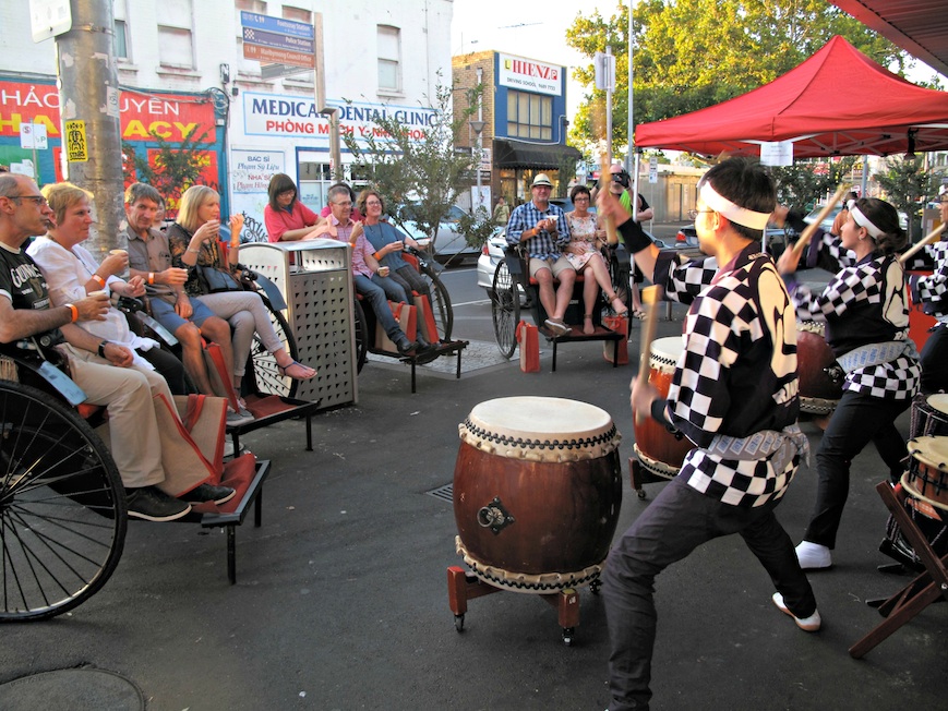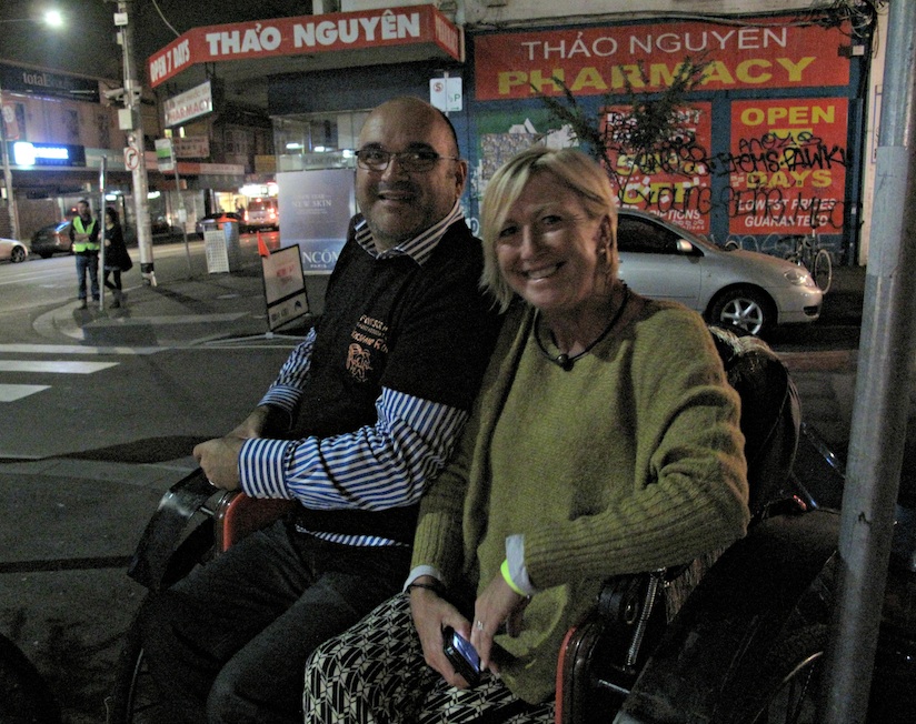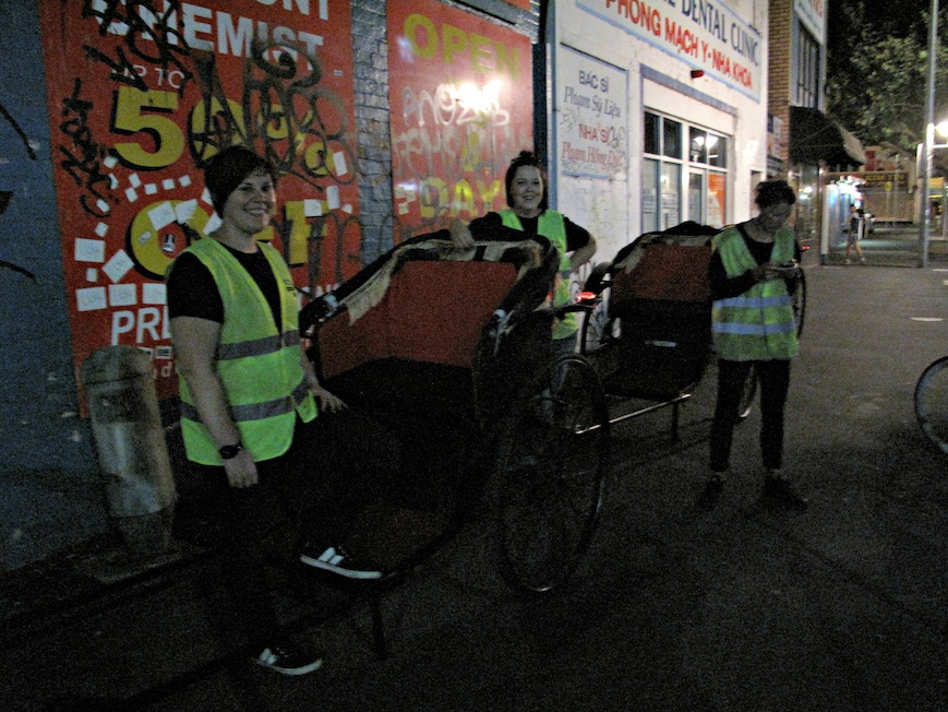Maribyrnong mayor Grant Miles gives rickshaw pointers on opening night.