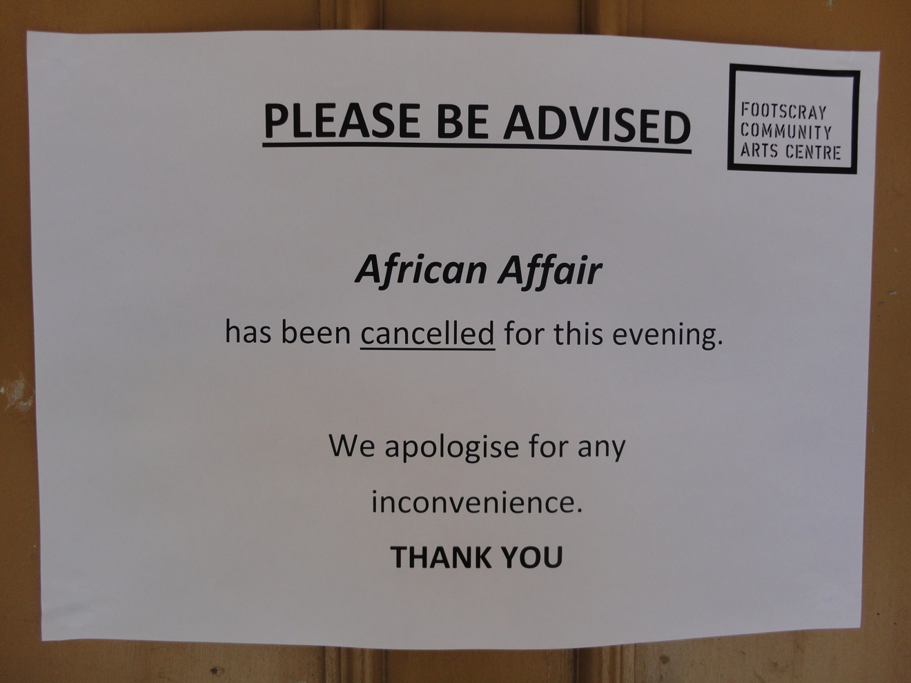 We subsequently find the above notice stuck to the centre’s office door – and feel a keen disappointment.