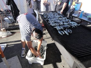 Before departing, though, we sneak around the back of the food tents to watch the sardines and prawns being cooked.