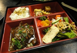 My bento of grilled, salted salmon with mustard miso ($17) has those salad bits and more – pickles preserved and fresh; crunchy lotus root crisps; potato salad in the Japanese style; half a mini-eggplant smothered in a miso sauce; great rice … it’s all terrific.