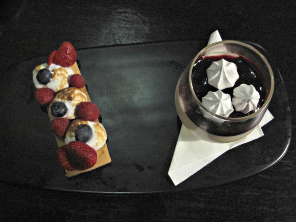 More appropriate for us is the luscious vanilla panna cotta with a berry and meringue topping and a fresh berry and cream shortbread off to the side.