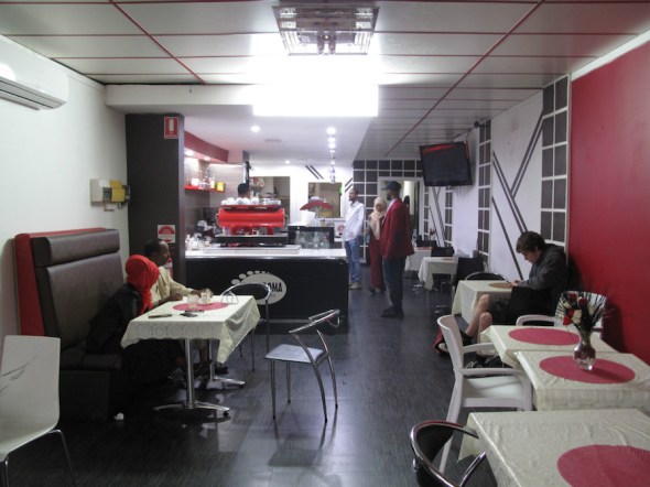 The dining room is a rather chic delight, with low-fi lighting (but still bright enough to see our food), plain yet fetching wooden tables, cushions scattered around and Ethiopian art work adorning the walls.