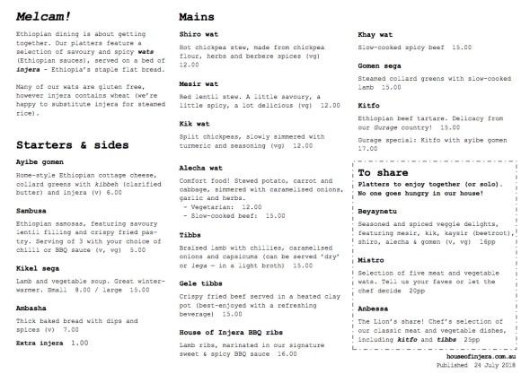 The House Of Injera menu (see below) is a simple, well-written list featuring many dishes with which we are familiar.