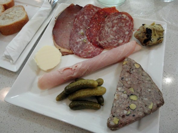 I share my pastry with a dining companion who has ordered the assiette de charcuterie (cold meat plate).