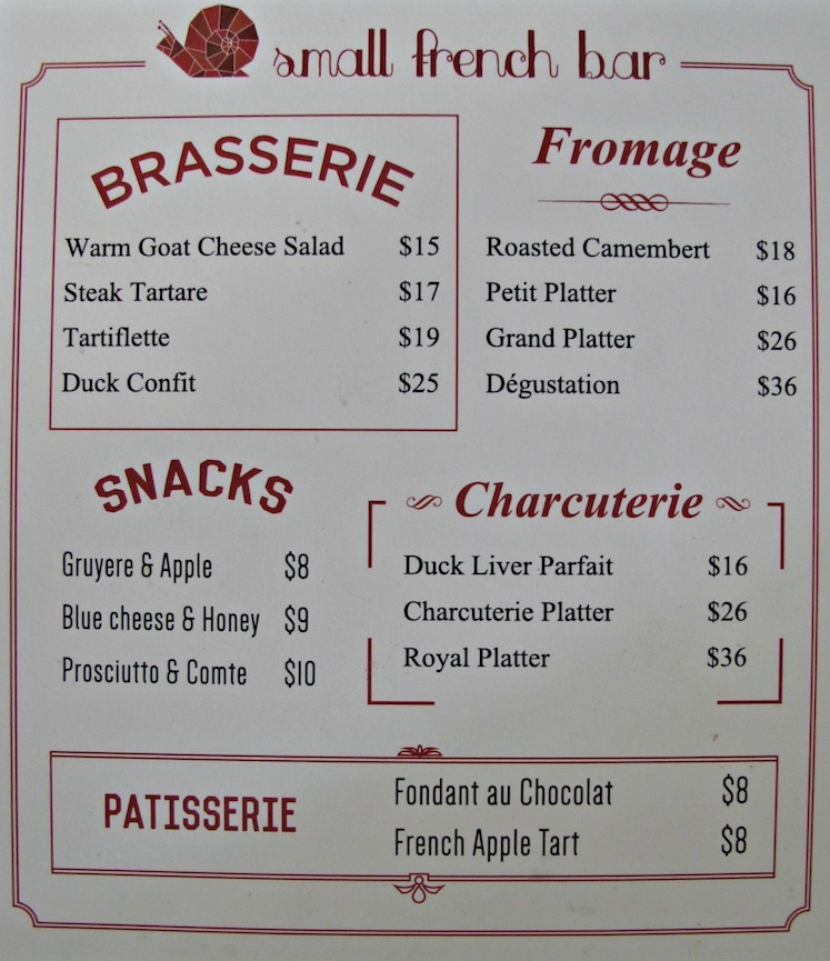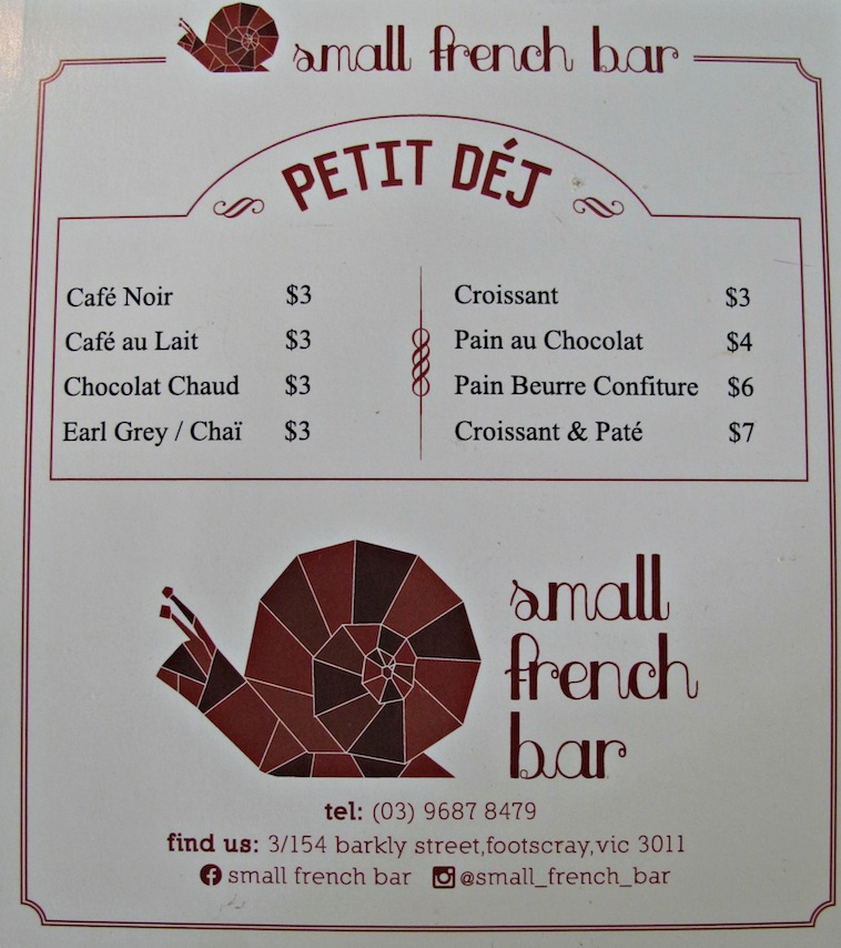 Small French Bar, Shop 3 154 Barkly Street, Footscray. Phone: 9687 8479