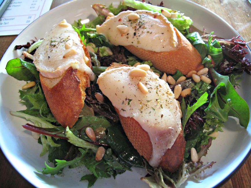 Sitting on top are three slices of fresh baguette slathered with fabulously flavoursome Buche de chevre, both warmed rather than toasted.
