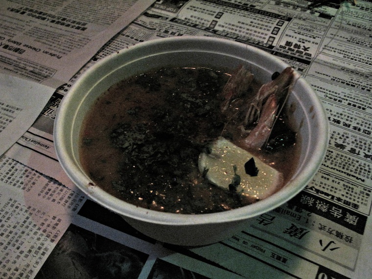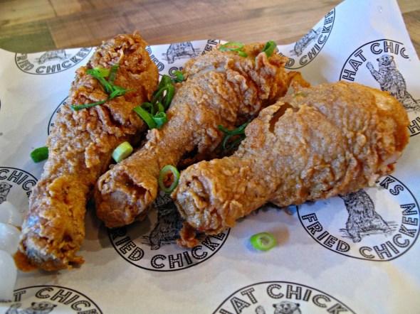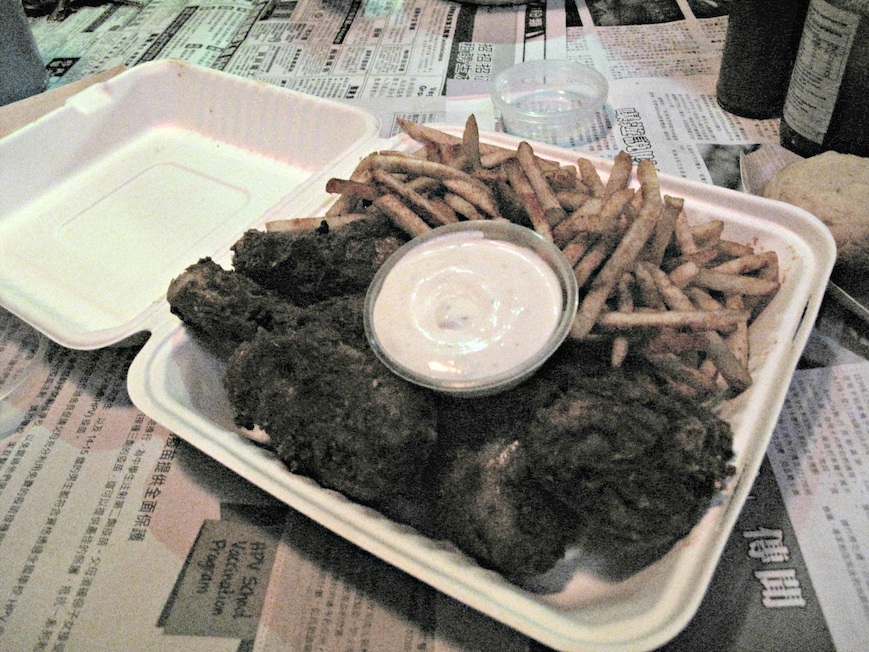 The chicken pieces are ungreasy and wonderful, the coating crisp and powdered with white pepper.