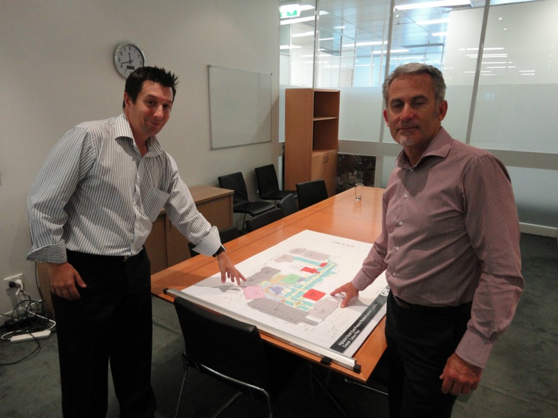 Centre manager Scott Crellin and development manager Mark Pheely with the Highpoint development plans.