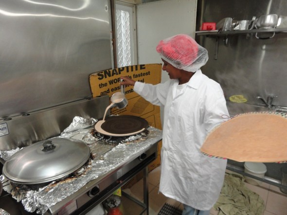In a minute or so, the injera – smooth side down, spongy side up – is ready to be equally skillfully slipped on to straw mats and placed on long tables with the rest of the day’s order.