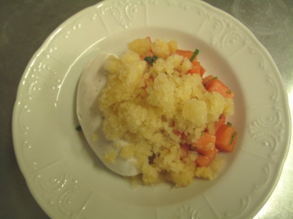 Meringue with pink pepper melon and apple granita ($12) is amazing.