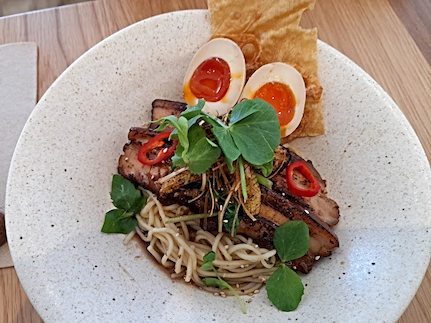 That porky stuff is served with Japanese ramen eggs, light wabasi dressing, beancurd skin, charred baby corn and spinach ohitashi.