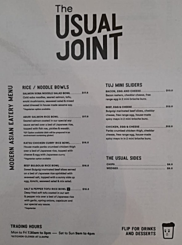 While our previous meals at The Usual Joint have been of a Vietnamese persuasion, the new list takes quite a different tack – with the usual capable crew taking a poke at the currently very “in” rice bowl fad and a likewise Japanese-influenced noodle salad.