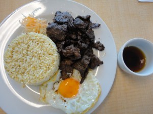The garlic rice was fluffy and flecked with egg. The fried egg was perfect. The marinated beef (I forgot to ask what exactly it was marinated in) was black, tough, chewy, but went real well with the little bowl of soy sauce-laced vinegar provided for dipping. And the little bundle of pickled papaya salad added another touch of piquancy.