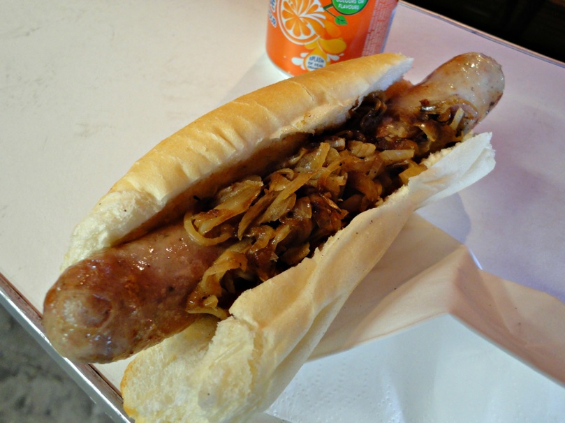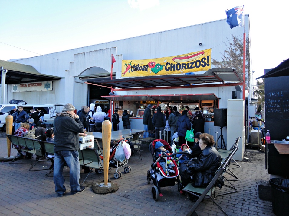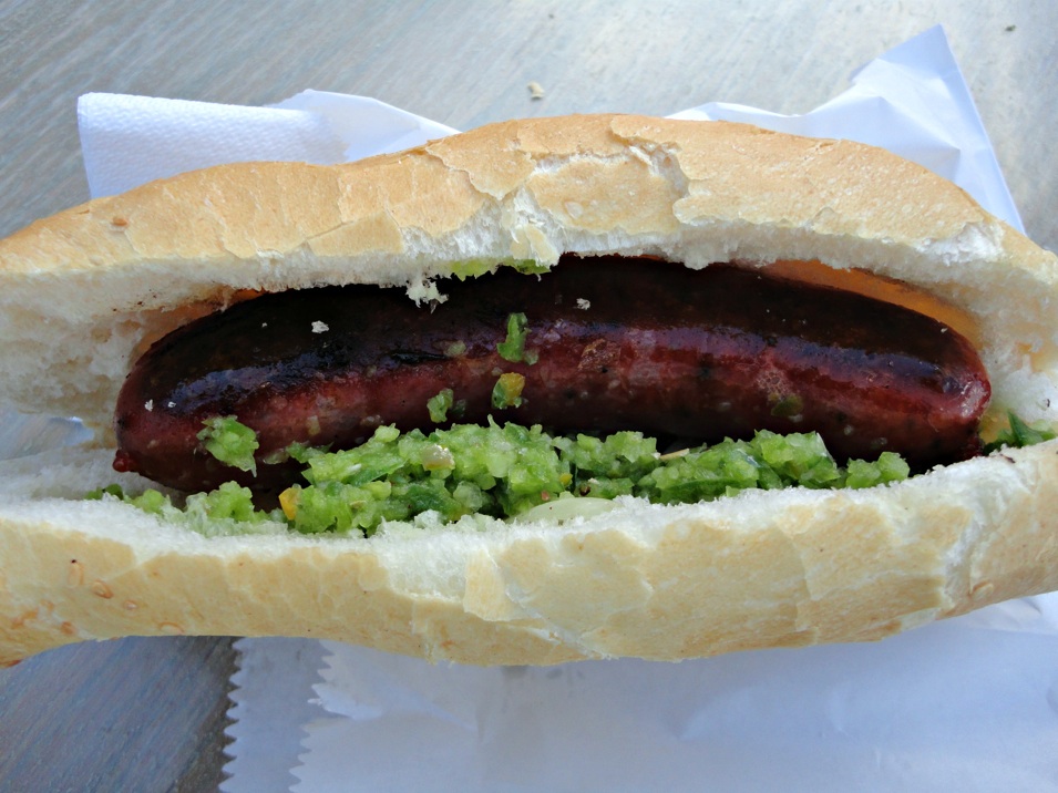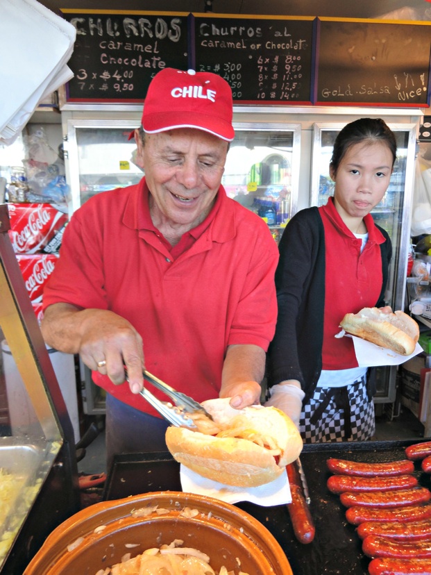 Still, hungry I choose next a chorizo ($7) from a stall run by a lovely, smiling Chilean dude and his friendly staff (top photo).