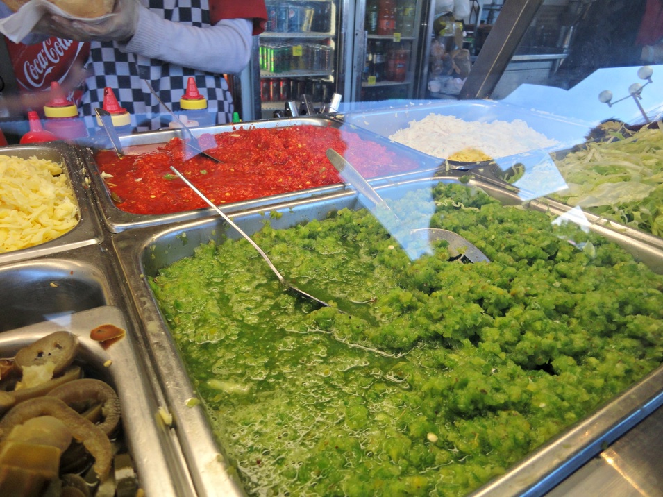 I go with the green salsa, but soon discover it’s tame, so return for a big dollop of the its red sibling. It’s not red hot either, but spices things up nicely and leaves a tingle on my lips.