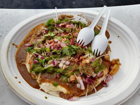 Toasted flatbread is anointed with chick pea curry, shredded daikon, red onion, a green minty sauce and coriander.