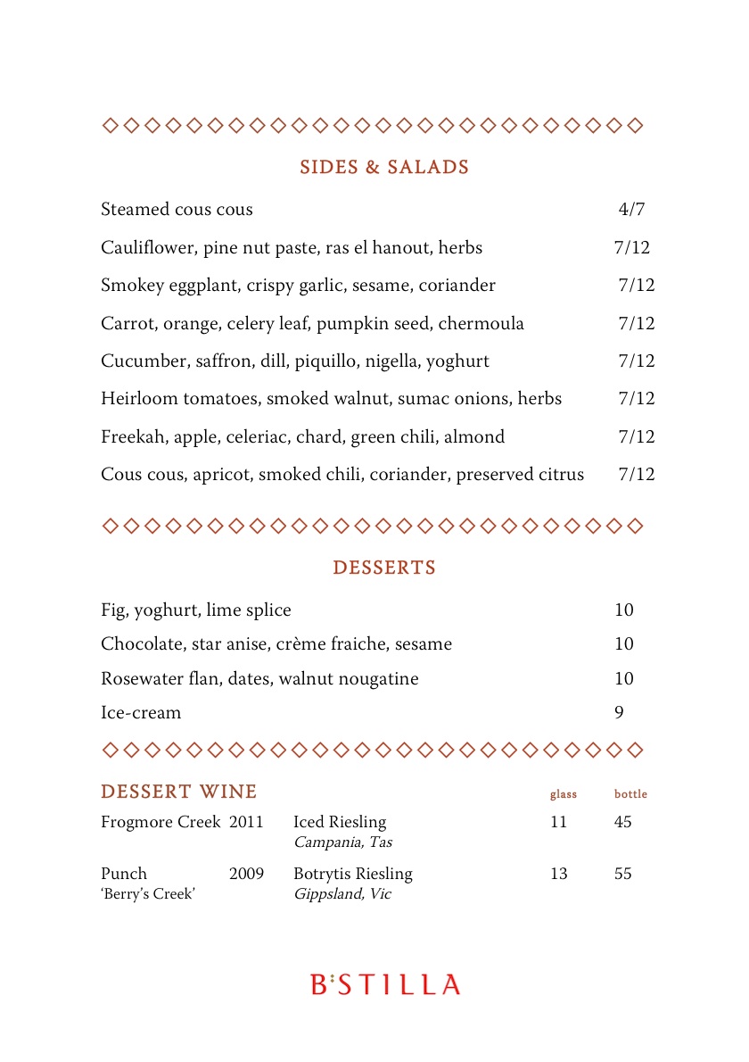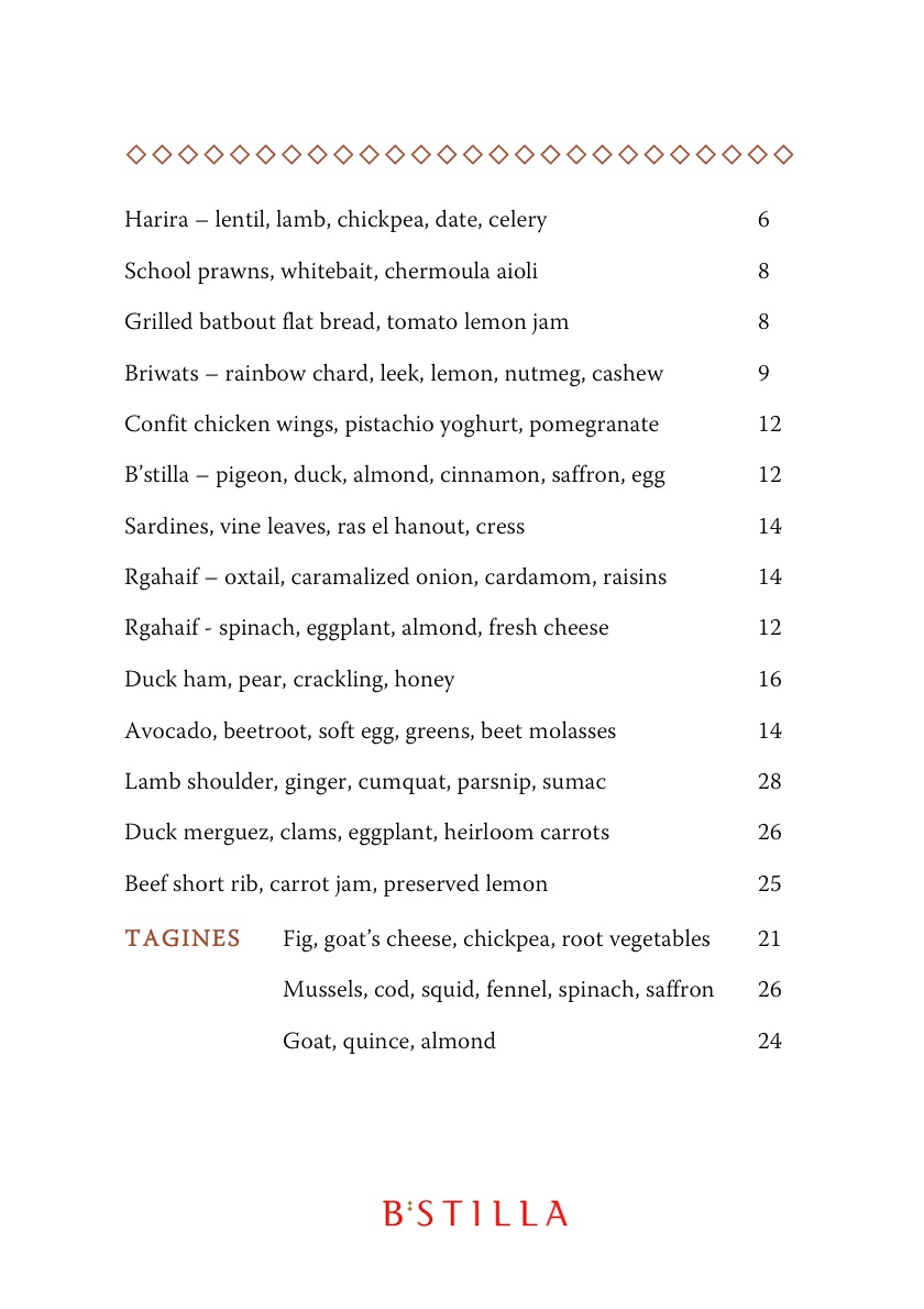 Although as you can see from the menu below, the pricing regime at B’stilla – especially given the location and the quality of the food – is actually very reasonable.