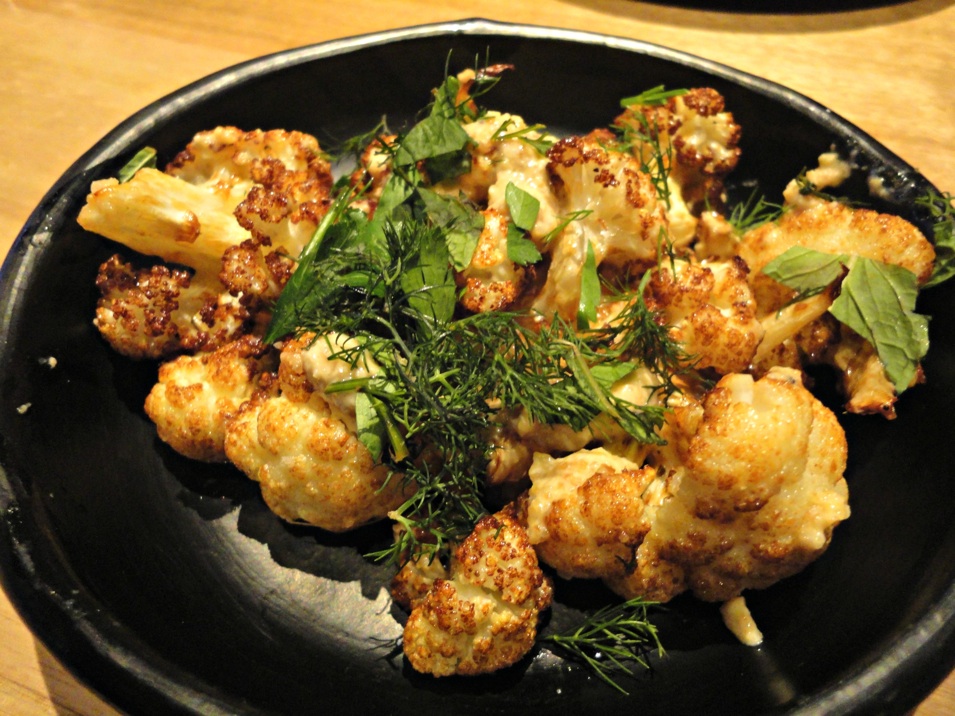 “Cauliflower, pine nut paste, ras el hanout, herb” is a more ritzy version of a humble side dish we regularly cook at home. It’s fine and proves that cauliflowers and ovens really do belong together. And I’m not talking about au gratin!