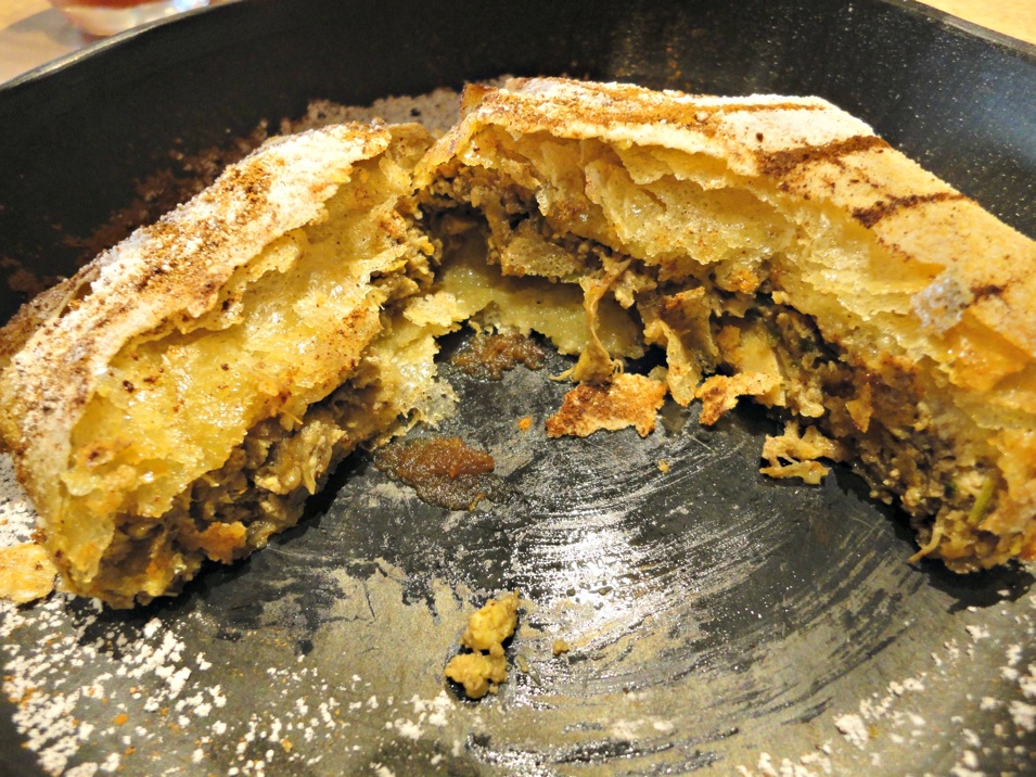 This is an unusual dish – for starters, it’s a savoury item that’s dusted with powdered sugar and cinnamon.