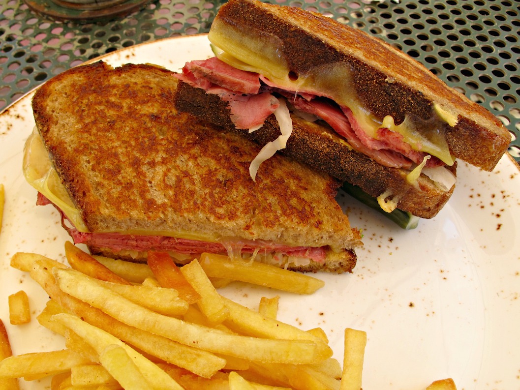 We grab one of the two outside tables.