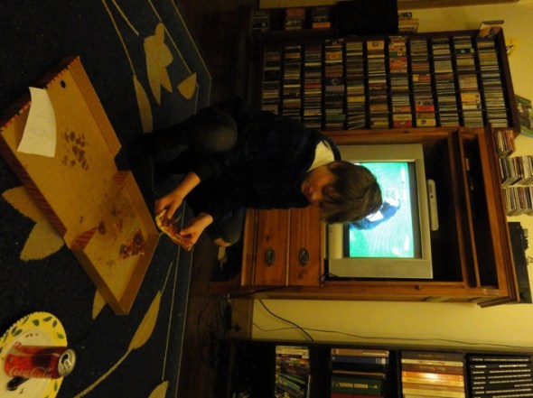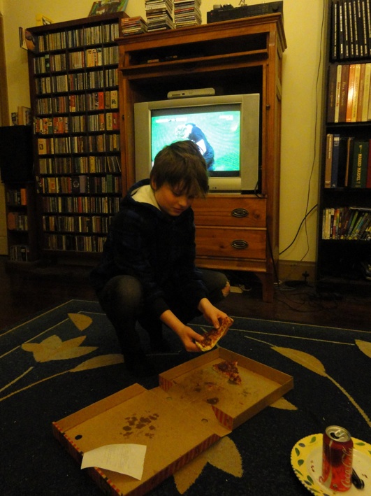 I find our pizza – a large meat lovers for $12 – much less greasy and gloopy than I had feared it would be. That processed ham stuff seems to dominate, and I discern no chicken at all. Then again, my sense of taste is shot, so what would I know?